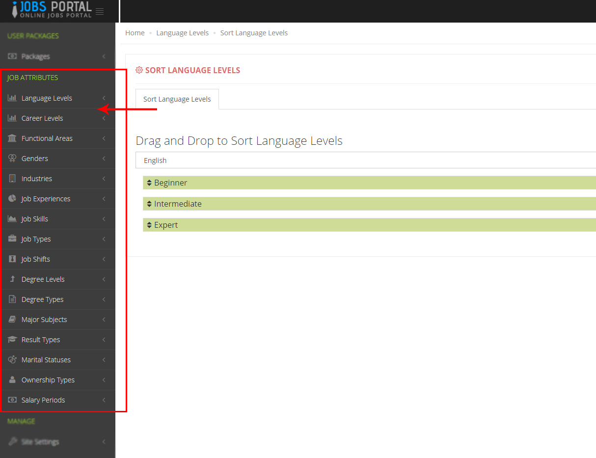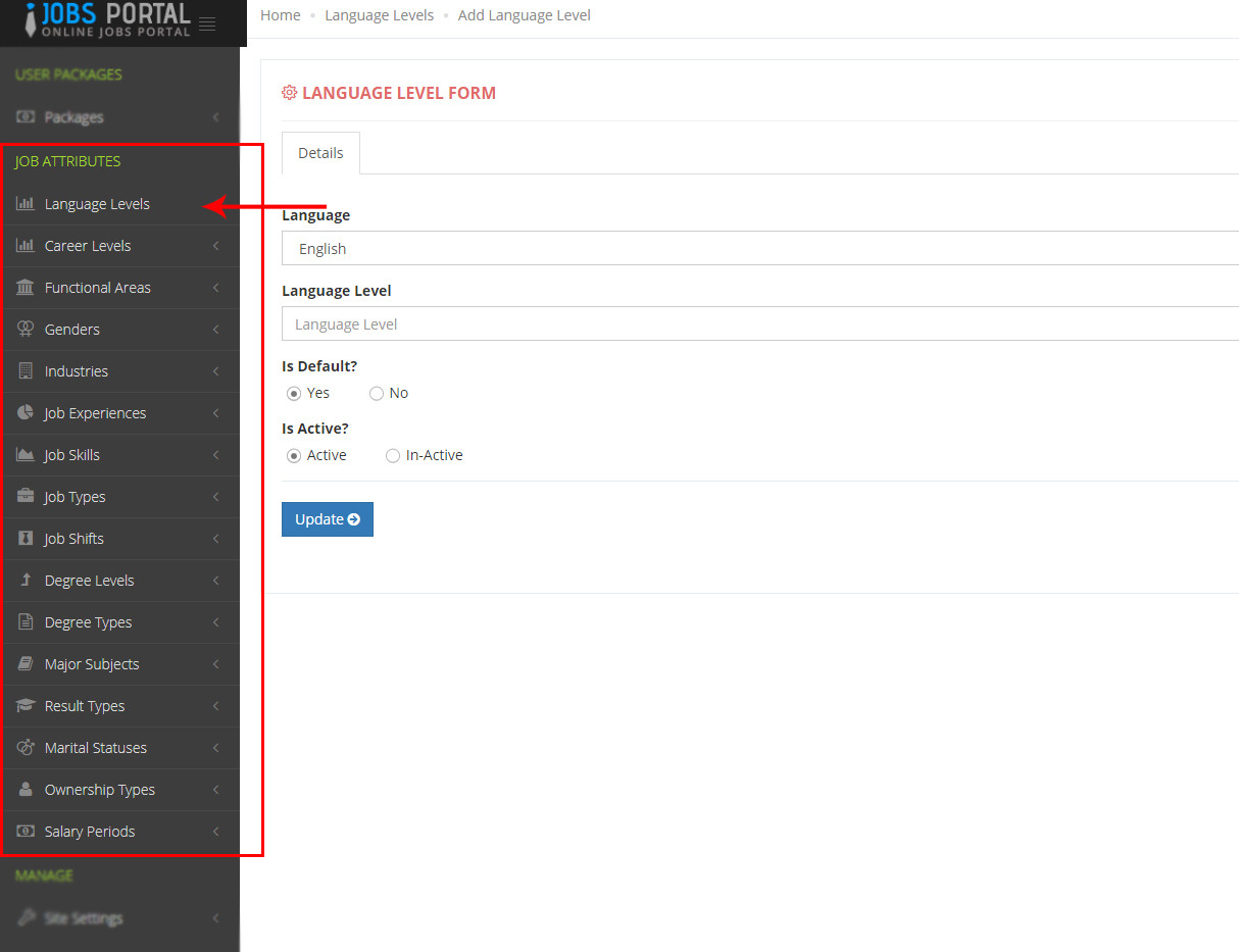 To manage job attributes see Attributes Section. In each section you have to add attribute for all langueas.