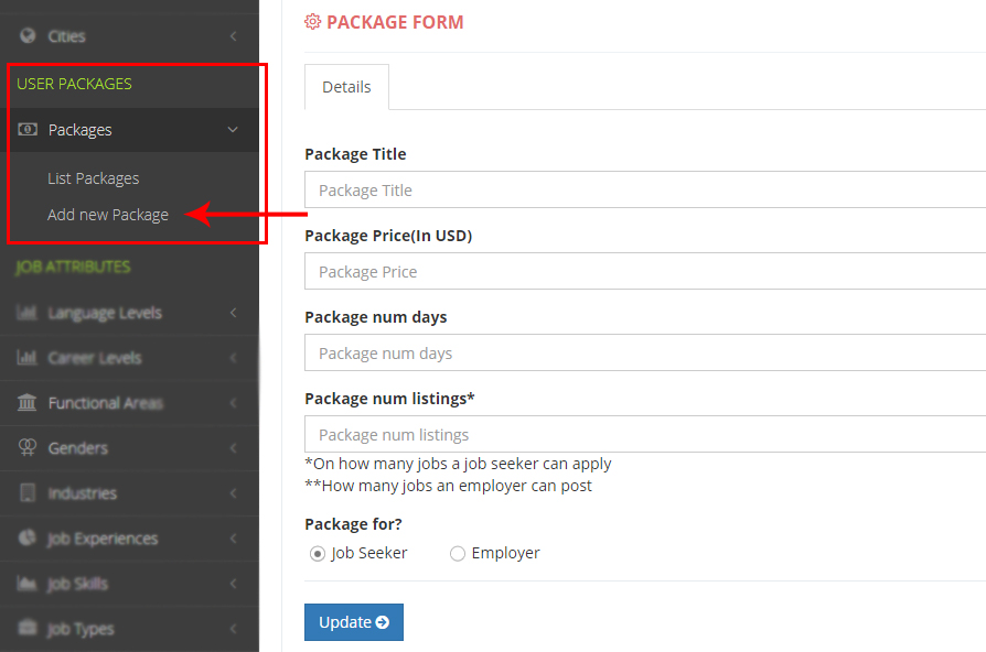 Admin can also assign package to every Employer or job seeker by editing their profiles.